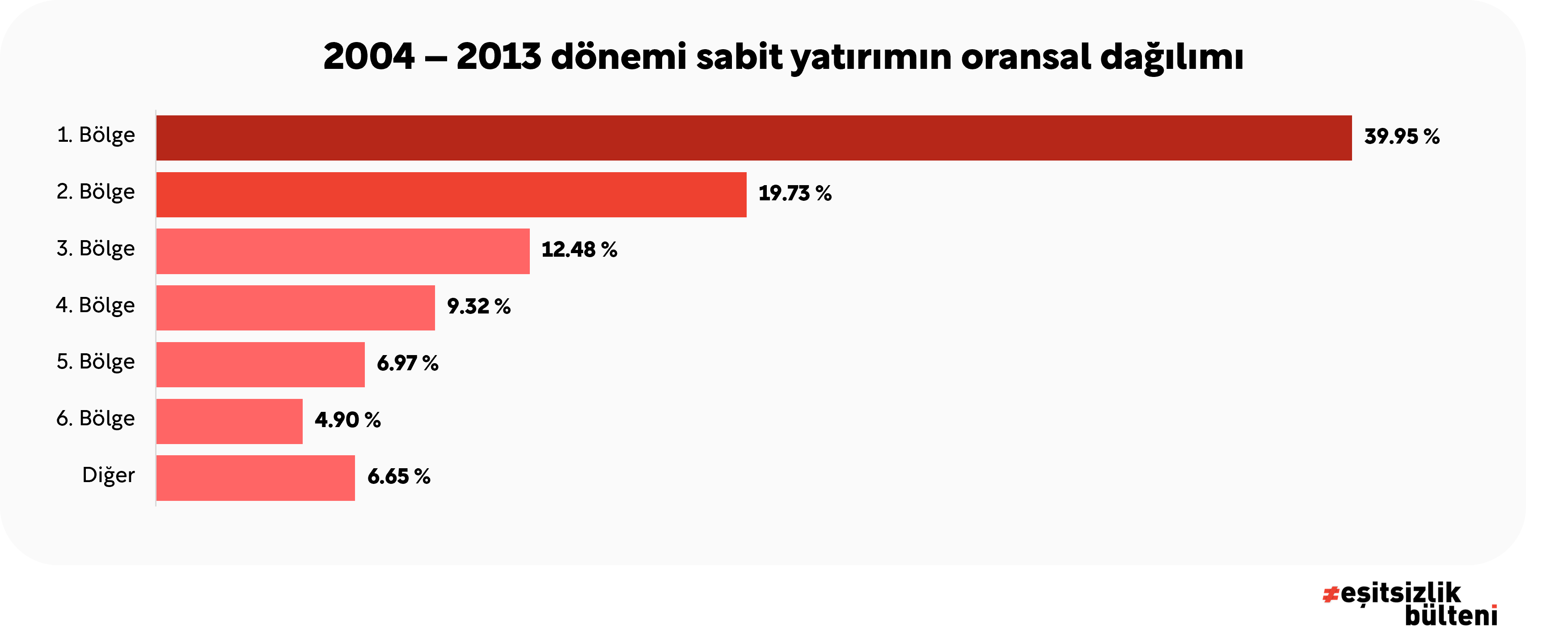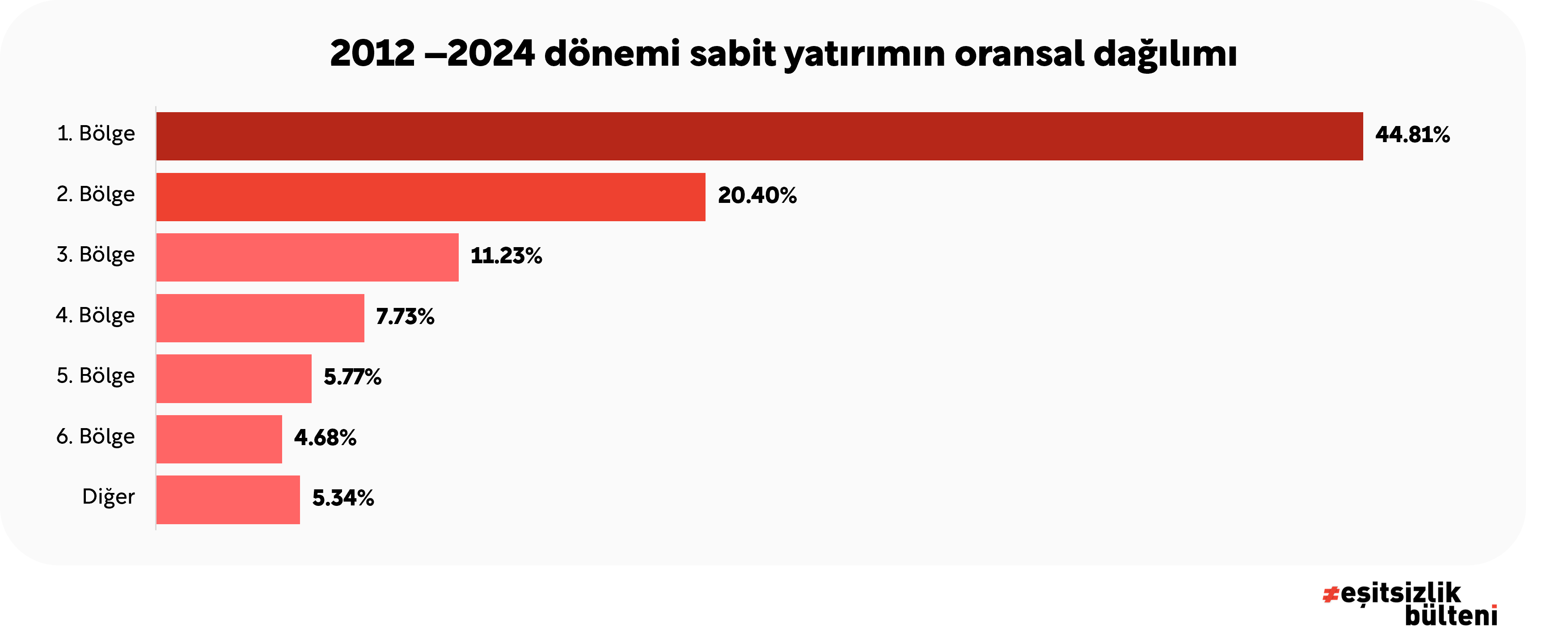 Daha çarpıcı olan şu: 6. bölge parasal yatırımda %4,69 pay alırken, 1. bölge %41,58 ile neredeyse 8 kat daha fazla yatırım çekiyor.